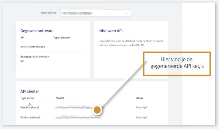On the next page you should now see the API keys. Copy the sandbox key and the production key and used these to configure the PostNL integration by entering these keys in the corresponding fields.